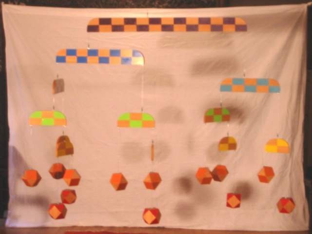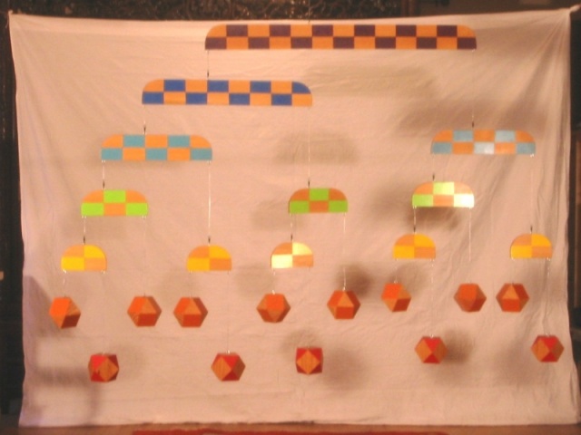 Having invented the Fibonacci Mobile, I did a simple Google search and, a bit disappointingly but not too surprisingly, I found Fibonacci mobiles that predated mine. Alison Frane of Loony Labs and Susan Goldstine of Saint Mary’s College of Maryland have created a number of different mobiles based on the Fibonacci Sequence. But I do claim as novel the idea of the single and double length suspensions, leading to the top-down Fibonacci count of the elements.