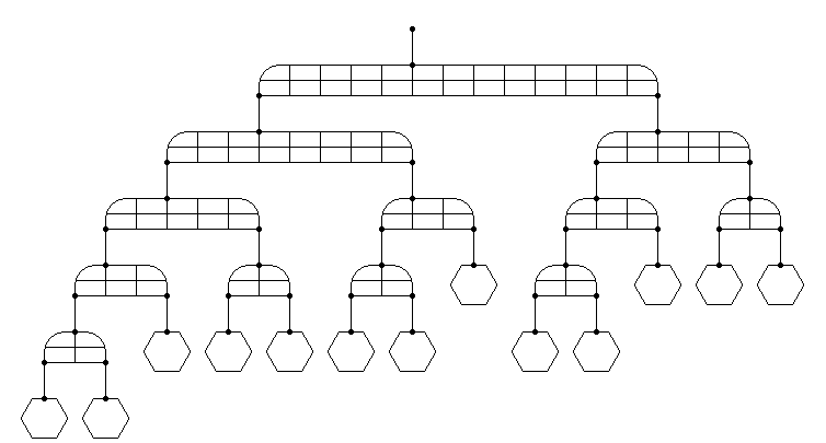 One of the desirable features of any mobile is its ability to spin about freely, without running into itself, and this design fulfills the requirement nicely. In fact, for any possible alignment of the arms, each level is symmetrical about its balancing point. Starting, for example, at the top element and descending always to the left we get steps of 5 + 3 + 2 + 1 + 1 to the leftmost block, for a total distance of 12. If we descend to the right we get 8 + 3 + 1, also 12. If you pick any other path from the top to a block on one of the bottom two rows, you will always get a 12, one less than the width of the arm. This works for any level in the mobile. Since the width of the arm is always one greater than the distance to the block, the blocks will never bump into each other no matter how the mobile is aligned.