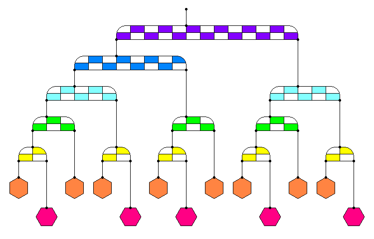 A further refinement to this plan is to suspend the elements at different heights. If you follow the rule that each heavy side is suspended with a length of 1, and each light side with a length of 2, you discover a very pleasing result: each level of the mobile consists of elements of the same size. Emphasizing this with a simple coloring scheme leads to the following: